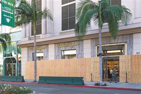 当地时间2日,洛杉矶富人区比弗利山庄上的奢侈品商铺用各式挡板加固门窗防止骚乱 图/人民视觉