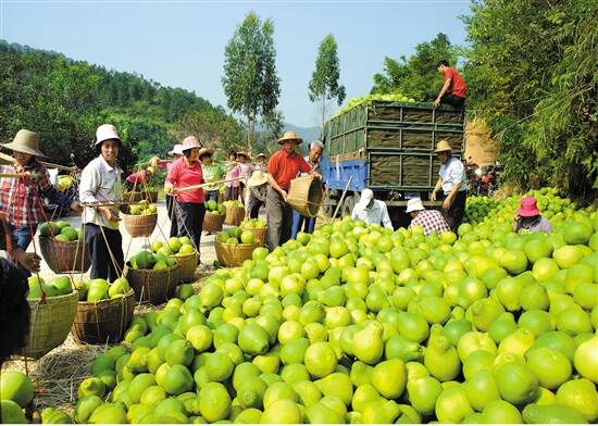 秋日阳光下,沿着县道025线进入梅州市梅县区东北部的桃尧镇,一片片的青绿色柚园成为一道美丽的风景线,柚农正将一筐筐的柚子挑到路边等待装车运货。“今年天气好,柚子大丰收。”桃尧镇螺江村村民张广顺笑着说。1986年,张广顺的父亲开始种柚子,成为全村第一个种植规模超过百亩的柚园主人。1992年,张广顺接过柚园后迎来柚子产销的高峰期。“政府重视、技术改良、品牌推广,柚子越卖越好,我们的收入也不断翻番。”