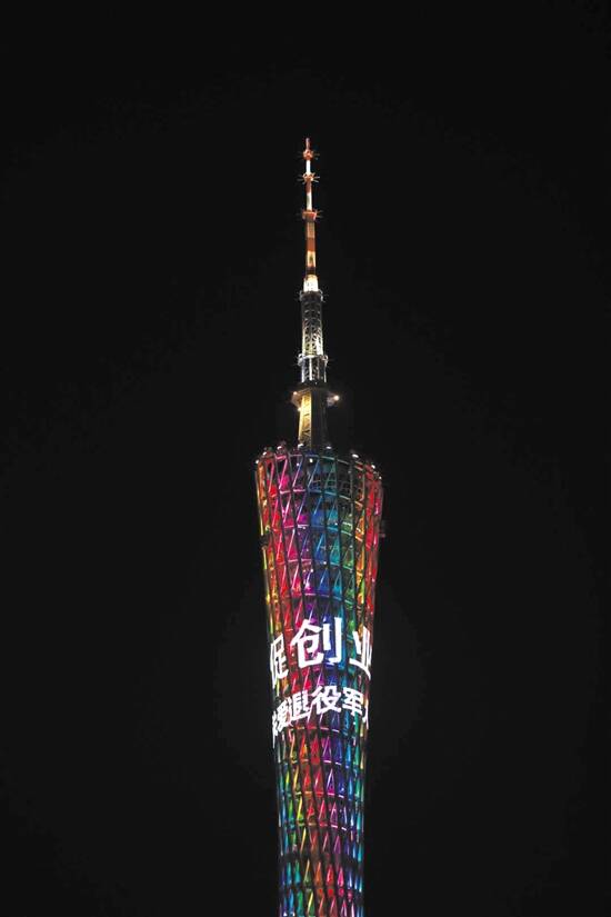 羊城晚报讯 记者侯梦菲、通讯员王寄丁摄影报道:11日晚,广州塔为退役军人创业就业亮灯,打出“热烈祝贺首届全国退役军人创业创新大赛决赛在穗举行”“助就业 促创业 用心用情用力关爱退役军人”等宣传语(见图)。据悉,11月11日至12日,首届全国退役军人创业创新大赛决赛在广州举行,来自全国的100个军创项目将在羊城激烈角逐、一比高下。