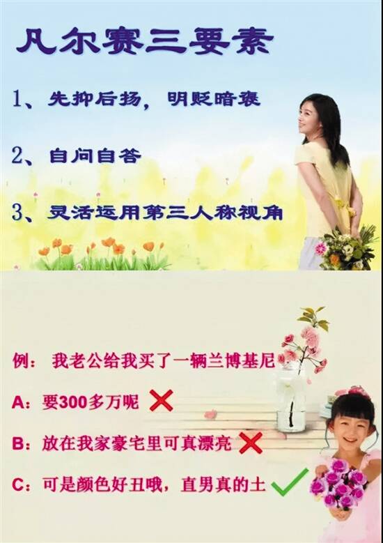 根据“小奶球”的说法,“凡尔赛文学”包含“三要素”:1、先抑后扬,明贬暗褒;2、自问自答;3、灵活运用第三人称。这样故作不经意地流露出贵族烦恼,是一种看似抱怨、实则暗喜的高级炫耀手法,用知名主持人何炅的话来说:“用最低的调,炫最高的耀。”这种炫耀不限于物质方面,也包括学识、品位、外表等,网友总结为“万物皆可凡尔赛”。