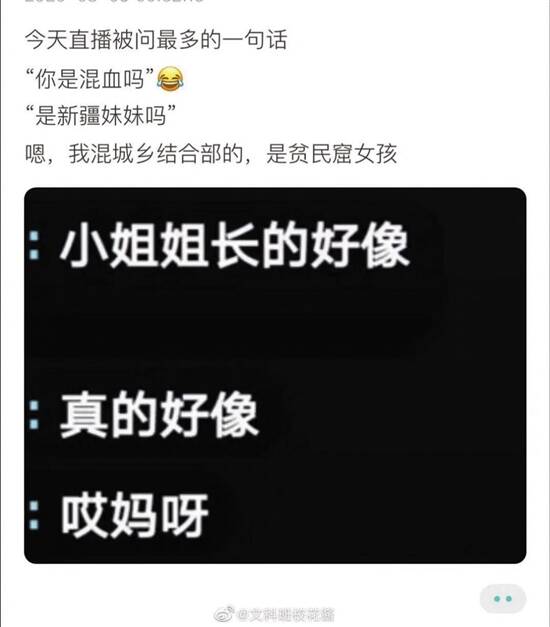 例三:“今天直播被问最多的一句话:‘你是混血吗?’‘是新疆妹妹吗?’嗯,我混城乡结合部的,是贫民窟女孩。”