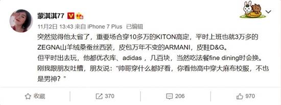 “蒙淇淇77”在她的一条微博中写道:“朋友问他怎么突然换了个别墅,他说,之前小区停车场的充电桩不够用,物业又不让装。为了他的特斯拉,他只能换个带私人车库的,必须有私人车库,才能装私人充电桩。哦,他对特斯拉才是真爱。我在旁边翻了白眼。他笑得可开心了,一把抱住我:‘哟,吃醋了?’”貌似云淡风轻的语气,却把拥有别墅、特斯拉以及跟老公的甜蜜感情包含在其中。