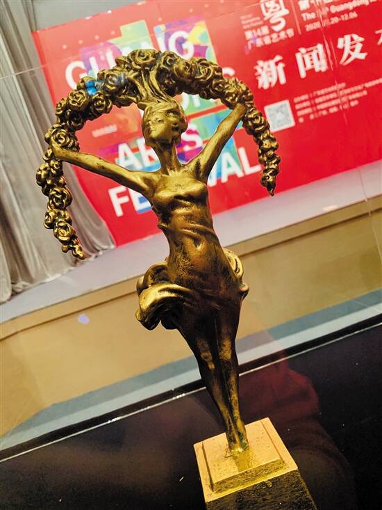 此外,主办方还特邀著名雕塑家、广州雕塑院院长许鸿飞为艺术节全新打造了以文艺女神为主体的奖杯,该奖杯以纯铜打造,头顶花冠的女神身形舒展、美感十足。