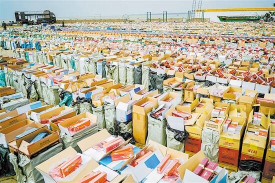广东海警近日在湛江市查获一起特大走私香烟案,当场查扣涉嫌走私香烟30余万条,包括26种国内外知名品牌,货值近7000万元人民币,为广东海警局成立以来查获的货值最大的一宗走私香烟案。图为堆放在货场待清点的涉嫌走私香烟。