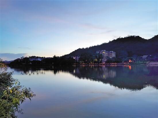 忽然间,宁静的流溪河水映入眼帘,河水波澜不惊,澄明如镜;加上蓝天映照,对岸星火点点,山峦起伏,树木参差,水上真实与水中倒影融为一体,让人迷恋于这梦幻般的山水之间……