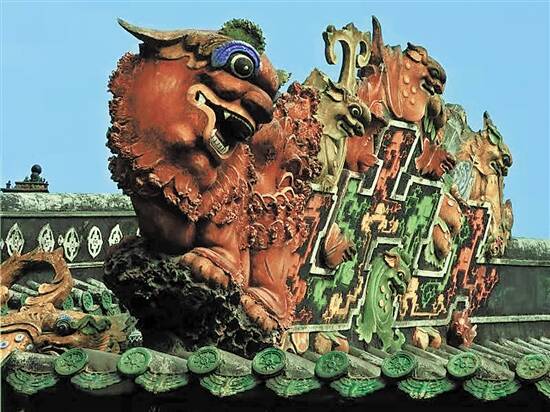 灰塑为泥塑彩绘艺术,形态夸张突出,线条粗劲有力,颜色对比强烈、绚丽多姿。灰塑主要安置于屋脊的基座、山墙、瓦面等建筑外立面以及屋顶等醒目的地方,体量大,所占的建筑面积亦多,在提升建筑的整体“亮丽指数”上,起先声夺人的作用。