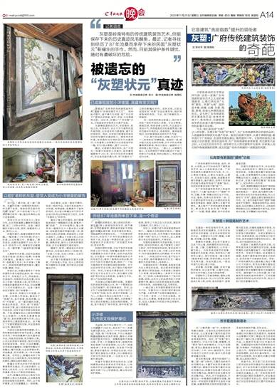 在广府传统建筑常用的几种装饰手段中,“三雕”显然起不了“提鲜”作用,石雕、木雕、砖雕分别衍生于石柱、木梁、墙体,色调与材质浑然一体,它们主要的装饰作用是让冷硬的梁柱和墙体变得柔和、雅致、高贵以及富于观赏性。真正赋予广府传统建筑斑斓亮丽、鲜活跃动色彩的是“两塑一画”——灰塑、陶塑、壁画,其中的领衔者是灰塑。