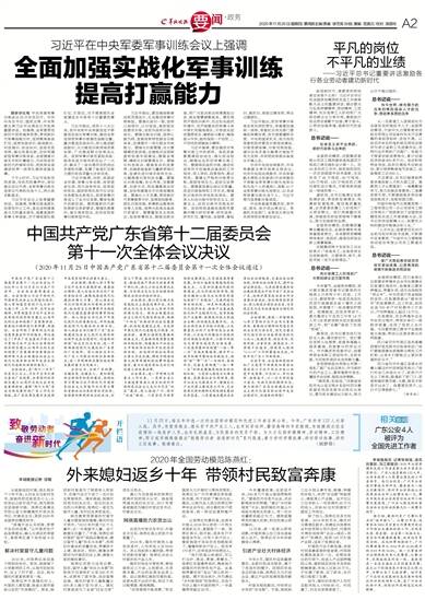 中国共产党广东省第十二届委员会第十一次全体会议于2020年11月24日至25日在广州召开。全会由省委常委会主持。全会坚持以习近平新时代中国特色社会主义思想为指导,深入贯彻落实党的十九大和十九届二中、三中、四中、五中全会精神,对贯彻落实习近平总书记出席深圳经济特区建立40周年庆祝大会和视察广东重要讲话、重要指示精神进行再部署、再推动。全会听取了李希同志代表省委常委会所作的报告,审议通过了《中共广东省委关于深入学习贯彻习近平总书记出席深圳经济特区建立40周年庆祝大会和视察广东重要讲话重要指示精神努力在全面建设社会主义现代化国家新征程中走在全国前列创造新的辉煌的意见》。