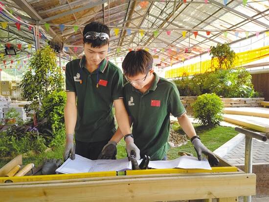 如何将一块长宽均为7米的沙池,在3天的时间内,变成满是绿植,还有小桥流水的花园?在广州市公用事业技师学院园艺项目训练基地里,周东和杨华雄正在紧张地作业。在他们身后的沙池经过两人的设计,早已变成充满岭南气息的小花园。