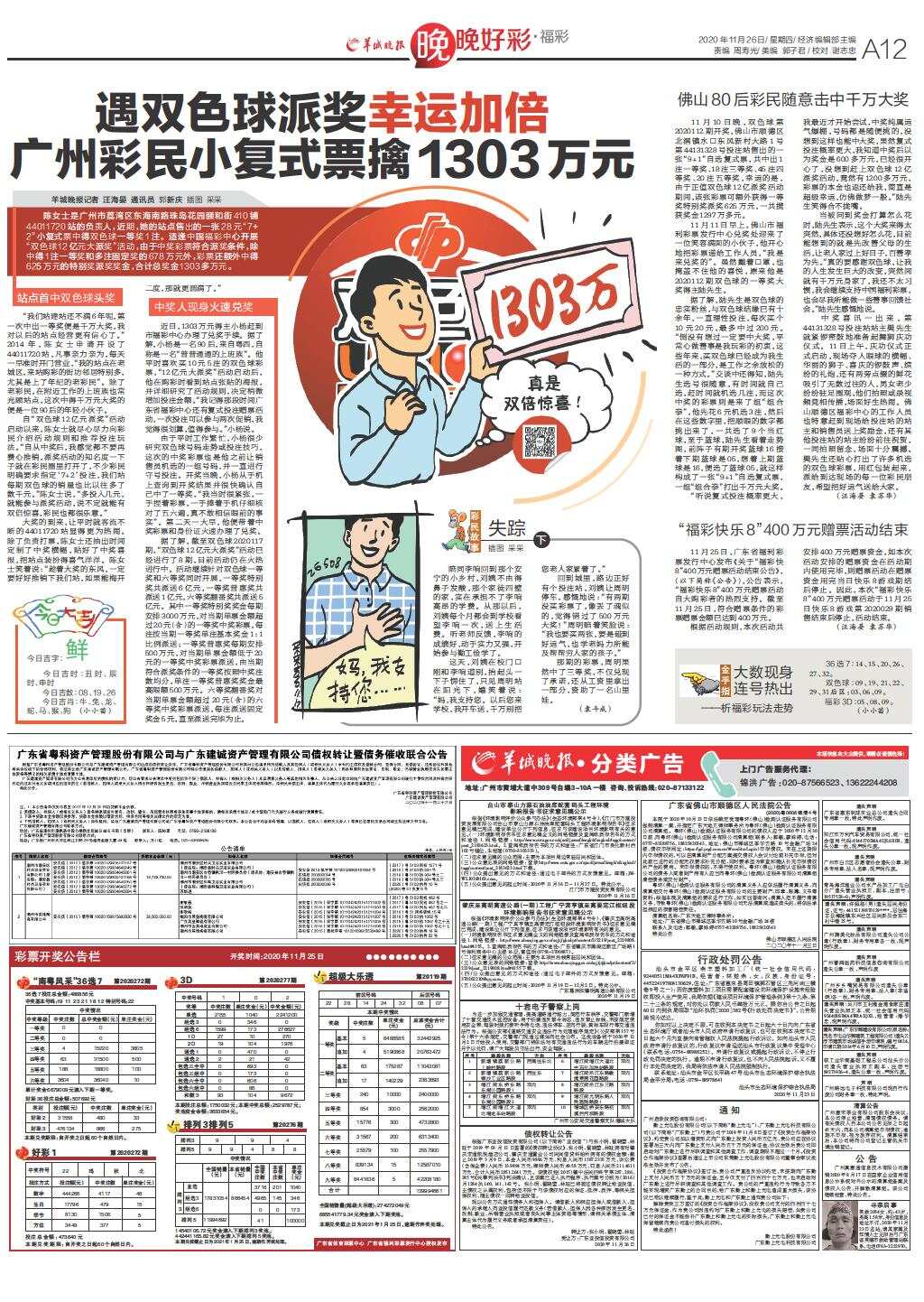 遇双色球派奖幸运加倍 广州彩民小复式票擒1303万元