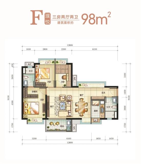 获奖理由:该户型属于东莞首创三房舒适户型,三房两厅两卫设计,南北通透、明厨明卫,是东莞楼市上少有的98平方米也能做到南北通透的优质产品。