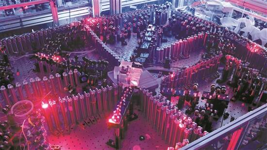 光量子干涉实物图:左下方为输入光学部分,右下方为锁相光路,上方共输出100个光学模式,分别通过低损耗单模光纤与100超导单光子探测器连接 新华社发