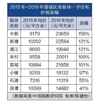 由于奥园等品牌房企在中新合力造城,中新板块的上涨潜力已经显现,中国指数研究院的分析数据显示,增城一手楼销量多年位居全市第一,而中新板块的房价涨幅在增城区位列第一(详见附表)。