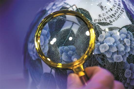 在现场,嘉宾手拿放大镜对着陶瓷上的微书细细端详,不禁发出阵阵赞叹声。原来,这位嘉宾观摩的陶瓷微书作品,在小小的瓷器上写了《资治通鉴》节选,字数达10万之多。