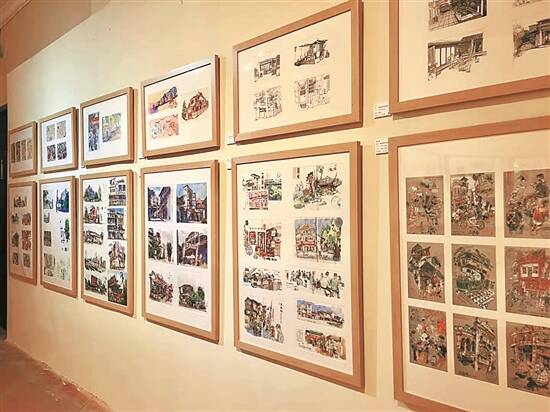 在参展作品中,有不少以广州标志性城市景观为主体,既有西关大屋、泮塘等传统风情,也有广州塔、珠江新城、广州大剧院等现代元素,还有荔湾湖、沙湾古镇等旅游景点。从整体来看,“速写广州”的画作选材钟爱老城景观和旧街区,他们的宗旨就是用画笔记录城市的蜕变,留下最美的记忆画面。在他们看来,老房子有烟火气,有人情味,视觉色彩丰富,老房子代表了一个时代的城市印记。骑楼、民房、满洲窗、铜铺……在他们笔下,老广州呈现出了别样的风情。