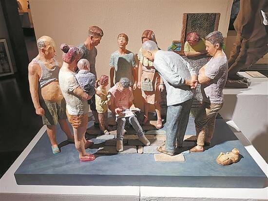 日前,广东省美术馆展出的《美好生活——广东省美术作品展》中,陈列着一件名为《周日·西关的街角》的雕塑作品,展现了一个正在写生的小伙子吸引了街边一群男女老少近来围观的场景。满洲窗、青砖路、橘猫等细节元素体现出老城区浓郁的西关风情和烟火气息。这一作品的灵感来源,正是职业雕塑家刘畅畅参加“速写广州”团队活动时现实场景的再现。