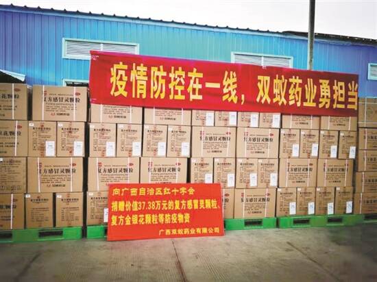 就在抗击新冠疫情的这场“战疫”中,双蚁药业先后向来宾市卫健委、兴宾区防疫指挥部、广西红十字会、来宾城中街道办事处、来宾市中心血站、广西中医药大学壮医药学院等单位捐赠具有治感冒、抗病毒、防流感作用的复方感冒灵颗粒和清热解毒的复方金银花颗粒,以及医用口罩等防疫物资价值超60万元。