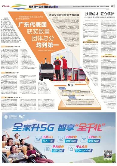 经过3天激烈比拼,中华人民共和国第一届职业技能大赛于13日晚在广州闭幕。这场新中国成立以来规格最高、项目最全、选手最多、影响最广的综合性、全国性技能竞赛盛会,吸引2557名选手在86个比赛项目切磋技艺、亮出绝技。广东97名选手参加全部项目的比拼,获得32枚金牌、13枚银牌、11枚铜牌,金银铜牌数量与团体总分均列全国第一。