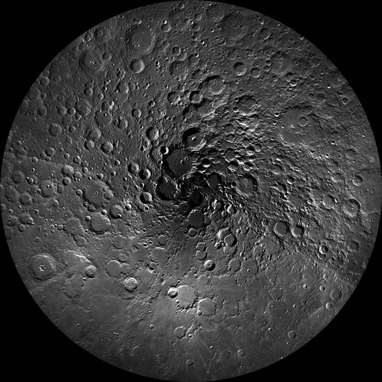 这张月球北极地区的图像,是由月球勘测轨道器相机(LROC)拍摄的。LROC的主要科学目标之一是识别永久阴影和接近永久照明的区域。这张照片是由LROC在月球北极夏季一个月内拍摄的983张图像组成