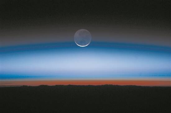 2011年9月26日,国际空间站上的“远征28号”的宇航员拍摄了这张照片。照片中的月球如钩,而下方的地球表面大气层清晰呈现出橙色与蓝色分界的对流层