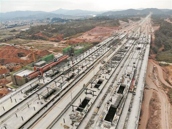 据中铁二十五局现场负责人刘波介绍,作为河源段内最大站点的龙川西站,位于龙川县佗城镇,设计为高架站,共设4站台12股道,其中正线4条、到发线8条,站台长度450米、宽度12米。根据设计规划,龙川西站还将作为赣深高铁与梅龙、广河高铁的交汇站,开通运营后将成为连接粤港澳大湾区与中原城市群、长三角地区线路上的一个高速铁路枢纽。