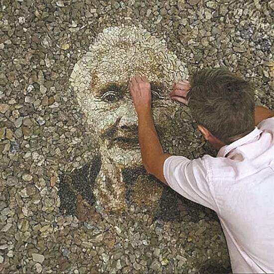 小河边、树林里、凉亭间……到处都是他创作的画板。他利用收集到的各色鹅卵石,拼出英国女王、西班牙画家毕加索、米开朗基罗的大卫和当地一个农民等不同人物的肖像,每一个作品都栩栩如生,让人叫绝。