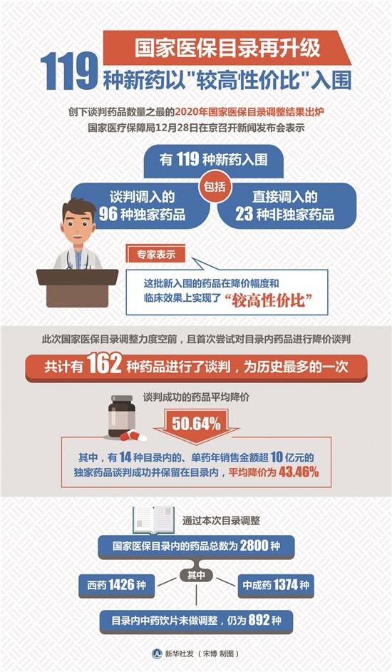 12月28日,经过此前激烈谈判,2020年国家医保目录调整结果终于出炉。国家医疗保障局在新闻发布会表示,有119种新药入围,包括谈判调入的96种独家药品和直接调入的23种非独家药品。