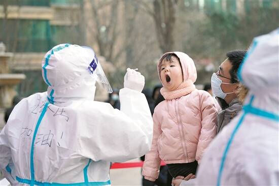 1月6日,一名小朋友在石家庄市桥西区恒大城内接受核酸采样 新华社发