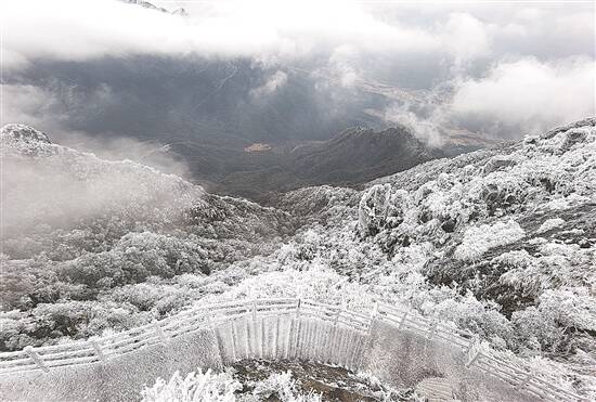 羊城晚报讯 记者陈强、通讯员黄琳雁摄影报道:受强冷空气影响,1月7日早晨,广东清远各地转阴冷天气。其中,清远连山金子山顶录得广东全省早晨最低气温:-3.9℃。金子山工作人员告诉记者,7日8时多,金子山山顶开始飘起小雪,当天下午已经出现积雪。金子山银装素裹,成为白色童话世界。