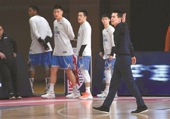 在浙江诸暨进行CBA第二阶段比赛中,北京队主教练解立彬(右一)离场后返回 新华社发