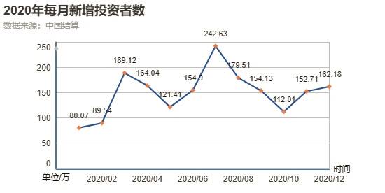 回顾2020年的月度新增投资者数量,全年月均新增投资者数量为150.19万人。从2020年月度数据来看,2020年1月、2月市场月度新增投资者数量为年度最低,两个月新增投资者数量分别为80.07万人和89.54万人。进入去年3月,新增投资者数量有明显上涨,当月新增189.12万人,环比增加近百万人,去年4-6月新增投资者数量分别是164.04万人、121.41万人和154.90万人,均维持在百万人以上,且6月新增投资者数量环比大增逾四成。