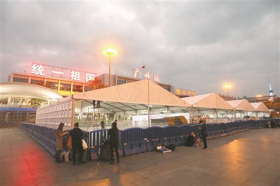 在广州市越秀区,历来有“提前10天进入春运状态”的传统。由于春节期间广州的天气常不稳定,现场工作人员都害怕下雨。“早些年,广场候车区设施缺乏,遇到下雨,旅客就得前往环市路高架桥底避雨,从而影响交通。为完善广州火车站广场设施,提升服务质量,多年来,铁路部门和越秀区地方管理部门已形成共识,每逢春运期间,就在广州火车站广场搭设临时风雨棚,为候车旅客提供遮风挡雨的环境。”广州市公安局越秀区分局党委委员、副分局长曾志坚告诉羊城晚报记者。