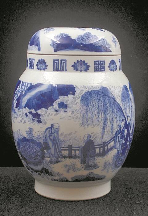 崇祯青花暗刻文王访贤莲子盖罐(谢中文藏品)