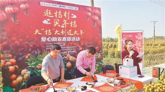 1月26日,羊城晚报联合番禺区融媒体中心来到番禺区石壁都那村,进行助农年花销售直播。本场直播邀请了番禺区文化名人——何穗鸿、谋叔、九爷以及桔农,为市民朋友们讲述寒冬年花年桔养护妙招、年花年桔的特殊寓意及摆放讲究、花农背后的故事、插花鉴赏及花艺搭配等。此外,番禺区文化旅游广电体育局何穗鸿局长在直播中挥笔祝贺年花年桔大卖,为助农活动的销售助力。