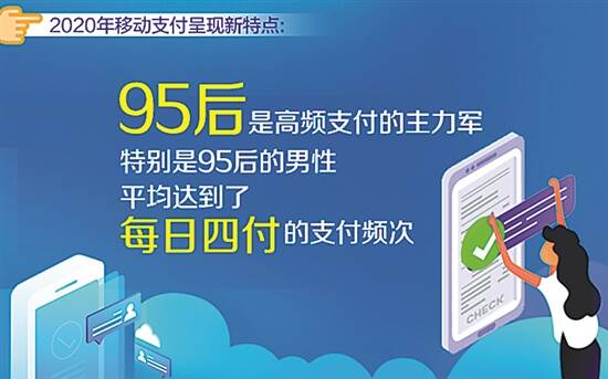 每日三付是2020年移动支付的平均水平,支付频次超过3次的比例较2019年大幅提升11%,超过5次的比例占总人群的1/4。“95后”是高频支付的主力军,特别是“95后”的男孩,平均达到了每日四付的支付频次,他们在点外卖、充值游戏点卡、网络直播购物的使用频率均超出其他年龄段人群。