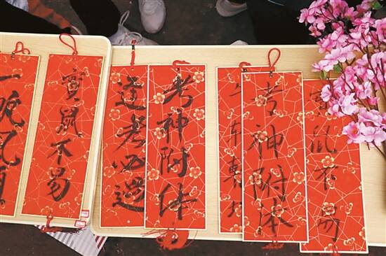 有书法才艺的同学“赚翻”了,“考神附体,逢考必过”的对联成为抢手货;“吃货”同学自制奶茶,真材实料又健康少糖,现场排队火爆不输网红奶茶店;有艺术细胞的同学自制各种小手工小摆件,其中环保袋上画“上马”寓意有趣,大受欢迎。
