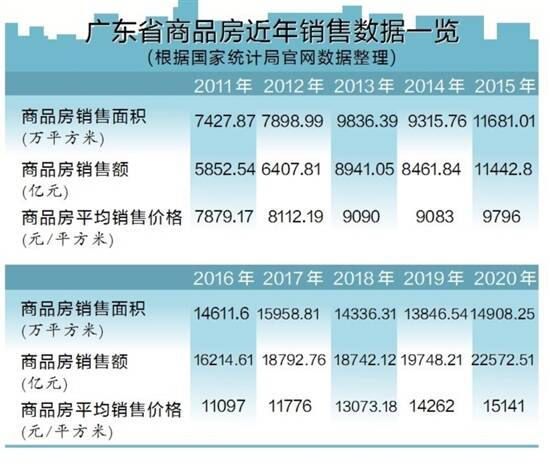 单就住宅而言,2020年,广东共销售住宅12930.66万平方米,销售额达19829.63亿元,销售均价达到15335元/平方米。统计数据显示,这也是广东住宅全年销售均价首次突破1.5万元/平方米,比全国平均水平高出5355元/平方米。