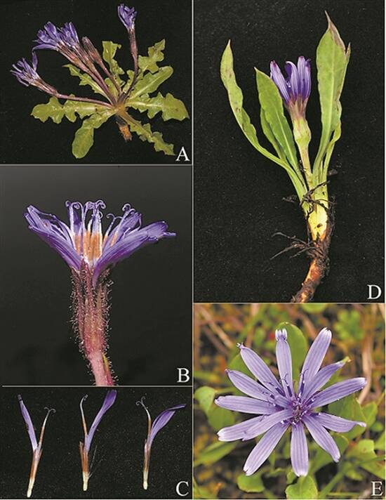 这两个开蓝色花的物种就是棕毛厚喙菊(现为“李恒菊”)、矮小厚喙菊(现为“矮小李恒菊”)。陈又生介绍,这两种厚喙菊主要分布于高黎贡山地区,为多年生近无茎草本、叶全部基生、花蓝色、瘦果柱状并具有不明显纵肋、冠毛棕褐色,是一个独特的类群。基于充分的证据,陈又生团队发表了菊科这一新属——李恒菊属。