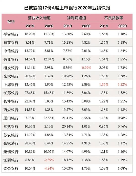 此轮银行板块的爆发并非无迹可循。羊城晚报记者梳理发现,尽管距离年报密集发布期尚有时日,年初至今,已有17家A股上市银行披露了2020年业绩快报。从已披露的17份业绩快报来看,资产质量持续改善,只有上海银行不良率上升0.06个百分点,达1.22%,其余16家银行的不良率均有下降。