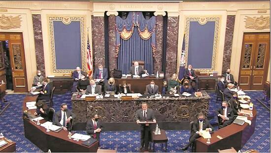当地时间2021年2月9日,美国国会参议院在审理特朗普弹劾案。当天参议院经过投票,以56票同意,44票反对的结果确认了对特朗普弹劾案的审理符合宪法。参议院将继续审理特朗普弹劾案。