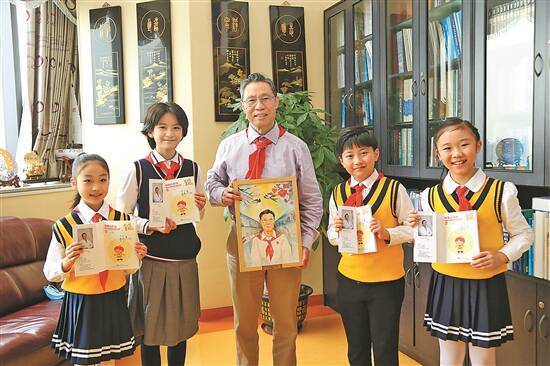 2020年4月10日,四位广东省少先队员代表向钟南山院士赠送手绘的“戴红领巾的钟南山爷爷”画像 通讯员 岳青 供图