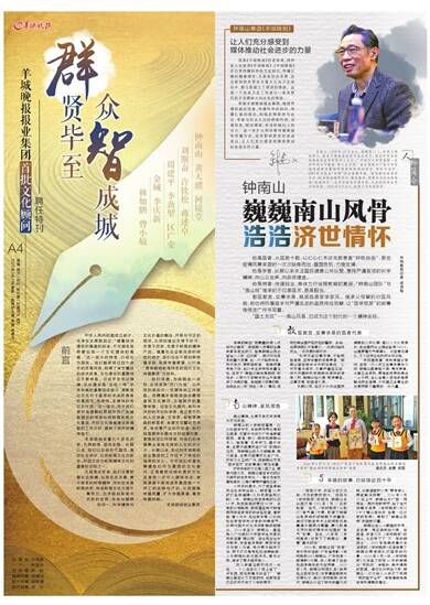 2003年,钟南山因“抗非”有功获中组部、广东省表彰,《羊城晚报》以《钟南山:广东抗非一面旗帜》为题,深入报道了他在抗击非典中的杰出贡献。2017年9月,钟南山和团队在《新英格兰医学杂志》发表慢阻肺研究成果论文,通过《羊城晚报》的专访,钟南山介绍了研究的重大突破,也寄语医护人员“要有爱心,要能解决问题”。2020年9月10日上午,钟南山与广医一院师生一同庆祝教师节,除了当天快镜与消息,《羊城晚报》还以《十个镜头告诉你 他是一位这样的老师》,展现了“钟南山老师”的医教双馨。