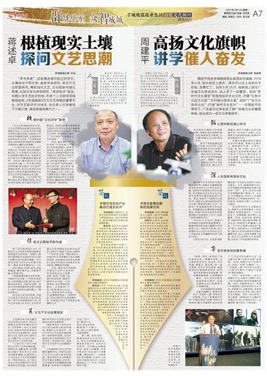 《羊城晚报》作为文艺传播的重要平台,持续关注流行文艺与主流价值观的发展。蒋述卓回忆与羊城晚报的文艺缘分时提到,多年前,应羊城晚报花地编辑部的编辑邀请,他有幸在羊城晚报开设了自己的“唐诗小札”栏目,自此与羊城晚报结下不解之缘,彼此之间的感情也越来越深。