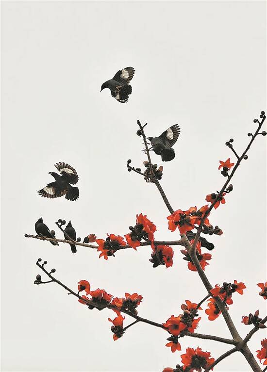 木棉花花朵虽大,却并不香。它对蜜蜂、蝴蝶没什么太大吸引力,却常常能吸引大批鸟儿来采蜜。