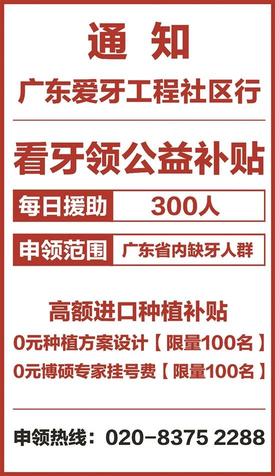 为进一步落实世界卫生组织8020计划,推进“粤口腔健康”建设,由广东省临床医学学会协办指导,德伦口腔连锁作为承办单位及技术指定单位的“广东爱牙工程社区行”启动,针对缺牙、无牙等口腔问题。市民均可拨打020-8375 2288申领种牙补贴,助力广大市民实现一口健康好牙。