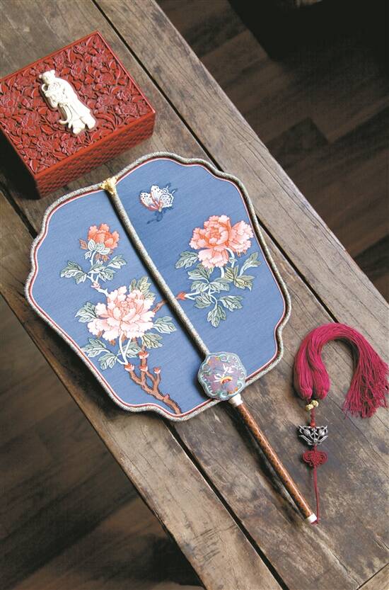 李晶:团扇的艺术性是多个工艺的综合体。在扇面丝织品上,我们可以选择缂丝或绫罗绸缎;在扇柄的制作上,可选择木、竹、骨等材料,还可作一些工艺雕刻。至于配件,可用上等丝线做成精致的中国结和流苏,配上和田白玉、翡翠、绿松、玛瑙、碧玺等,范围也很大。我们能想象到的许多手工艺,只要想用,大多都能用在团扇上。