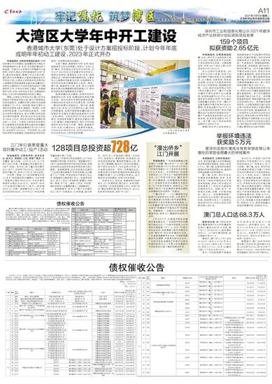 羊城晚报讯 记者陈卓栋,通讯员唐达、赵可义、陈敏锐、江讯、谭耀广报道:草木蔓发,春山可望。3月8日上午,江门市举行2021年第一季度重大项目集中动工(投产)活动。全市共128个重大项目集中动工(投产),总投资728.4亿元。活动主会场设于蓬江区,其余六个市(区)设分会场。