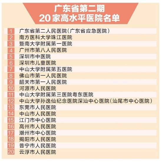 羊城晚报讯 记者张华、通讯员粤卫信报道:2月7日召开的全省卫生健康工作会议透露,2021年,广东将出台进一步推动高水平医院建设发展的实施方案,遴选新增20家重点建设医院。近日,广东省第二期20家高水平医院重点建设医院名单出炉(见表)。