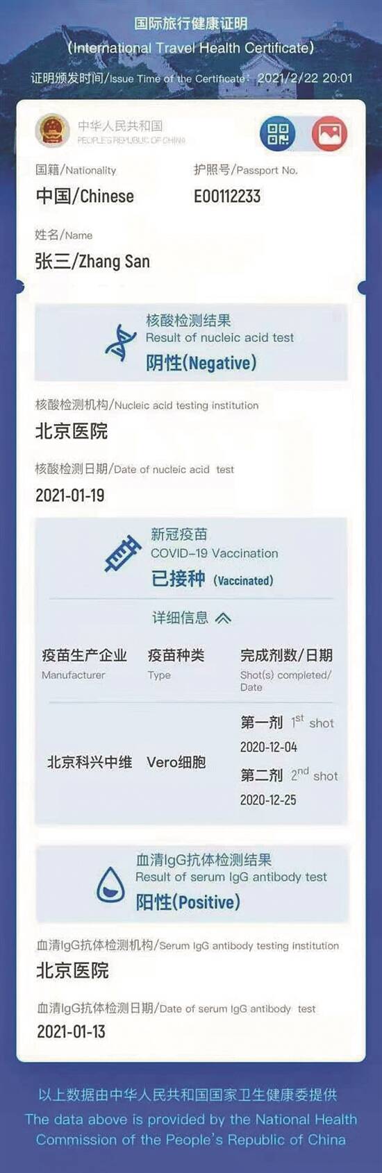 中国版“国际旅行健康证明”电子版样例。(图片来自外交部“领事直通车”微信公众号)