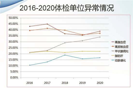 广东省人民医院惠福分院体检科主任符力介绍,在2020年,省医体检中心接待体检人次为37791人次,其中排前10位的异常结果为高血脂症、高尿酸血症、甲状腺病灶、脂肪肝、动脉硬化、心电图异常、尿常规异常、血压升高、胆囊息肉、肝功能异常。